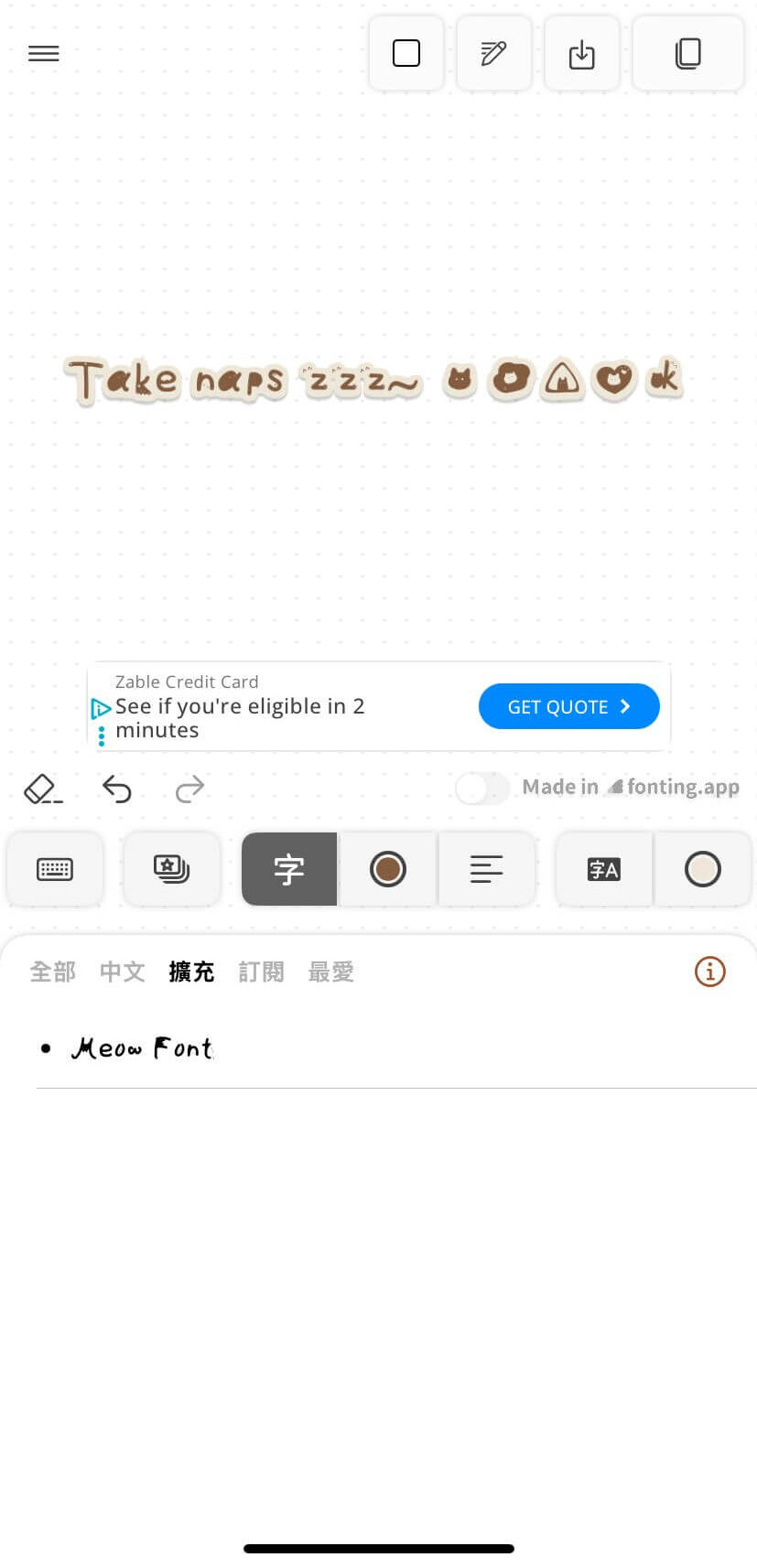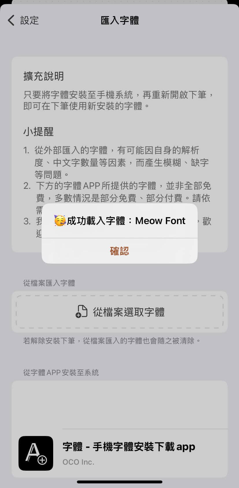 - 顯示匯入成功,可在字體庫【擴充】欄找到【Meow Font】